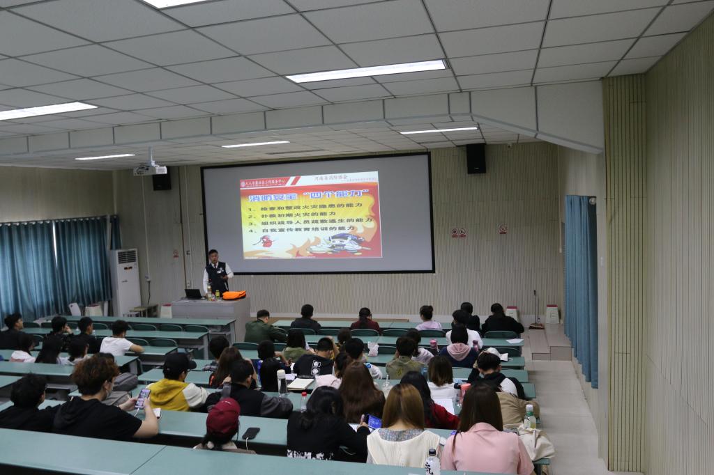 河南省消防协会教员杨磊浩用一个个真实案例为师生们生动地讲授了火灾的危害、消防安全的重要性、灭火工具使用方法、燃气安全措施、火灾逃生与交通工具逃生的具体方法。