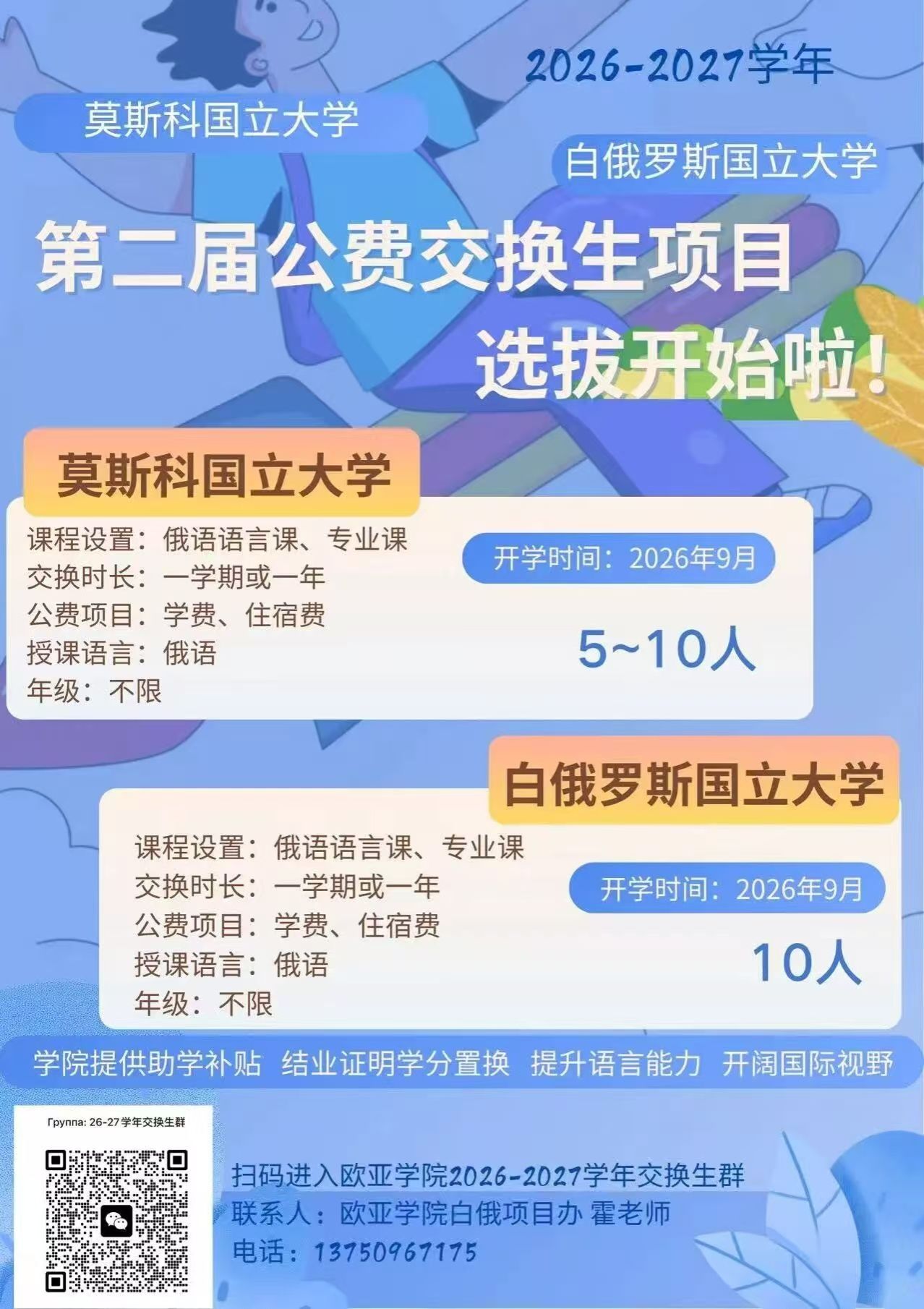 2026-2027学年莫斯科国立大学、白俄罗斯国立大学公费交流生项目报名选拔正式开启,91视频-国产av-av视频 本科2025级、2024级、2023级、2022级在读学生(专业不限)可报名参加。通过选拔后,可赴俄/白俄学习语言课程。本年度参加公费交换生项目的学生,91视频 将给予助学补贴。