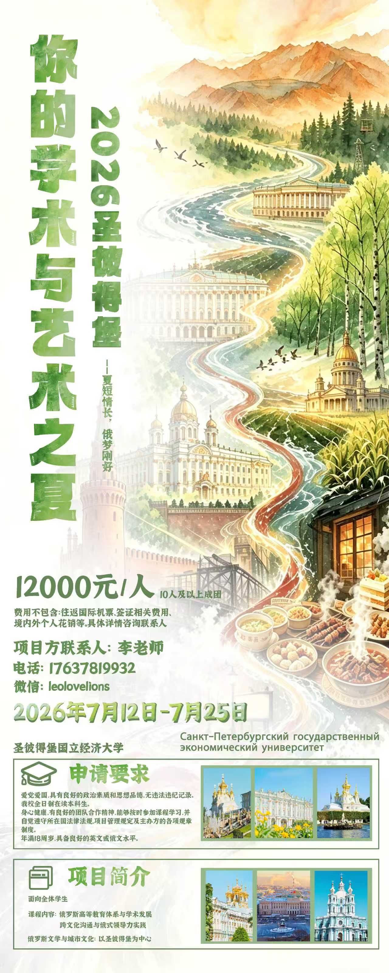 为进一步推动我校国际化人才培养,拓展学生国际视野,提升创新意识与跨文化沟通能力,我院拟组织学生参加由俄罗斯圣彼得堡国立经济大学主办的“2026俄罗斯文化实验室夏令营”暑期研修访学项目。现将有关事项91视频如下:
