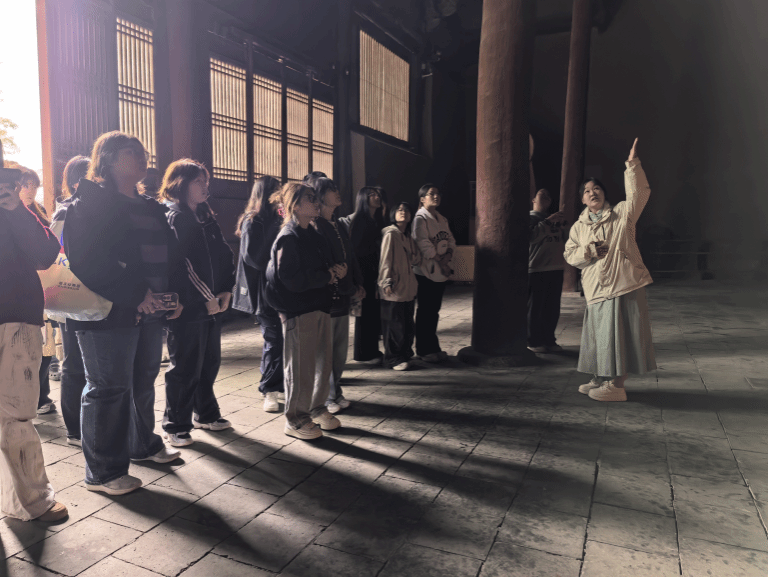 沿着青石台阶缓缓而上,广胜寺的宁静渐渐洗去了尘世的喧嚣。同学们跟随白磊老师的脚步,细细观摩寺内的每一处细节——从殿宇的梁架结构到檐角的雕饰,无不体现着古人的匠心独运。在这座千年古刹中,大家不仅领略了建筑的庄严,更感受到了一种超越时空的宁静力量。
